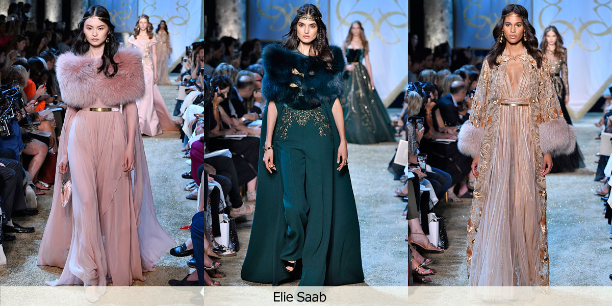 Winter is coming, and Saab went all out with medieval warrior queens that made everyone think of Game of Thrones and its powerful female message. Dyed fox wraps in dusty rose and petroleum blue were gorgeous accents against sweeping gold-embroidered gowns and capes (capes: definitely an autumn couture trend) and came closed with gilded fastenings.