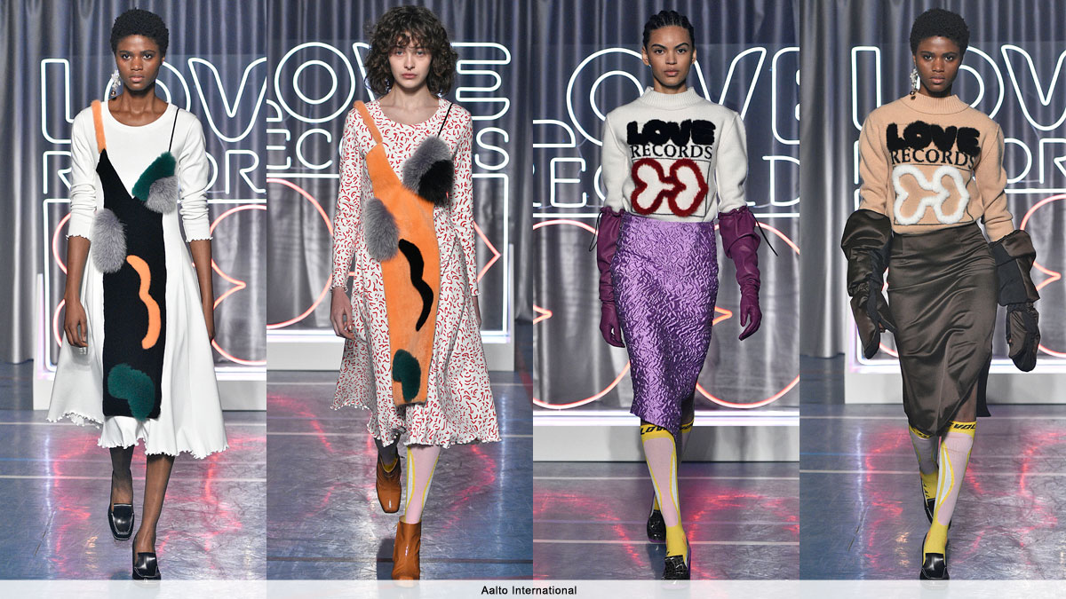 Tuomas Merikoski’s creative collaboration with Saga Furs resulted in another collection of clever and eye-catching fur looks, among them a sweater with Saga® Mink appliqué wording. Drawing on his Finnish motherland’s fondness for juxtaposing the strange and the normal – resulting in what’s come to be known as “Finnish weird’ – the designer showed simple daytime dresses overlaid with slinky, strappy intarsia Saga® Mink and Fox dresses. It was a lovely comment on the complexities of women, and how fantasy and reality coexist in fashion.