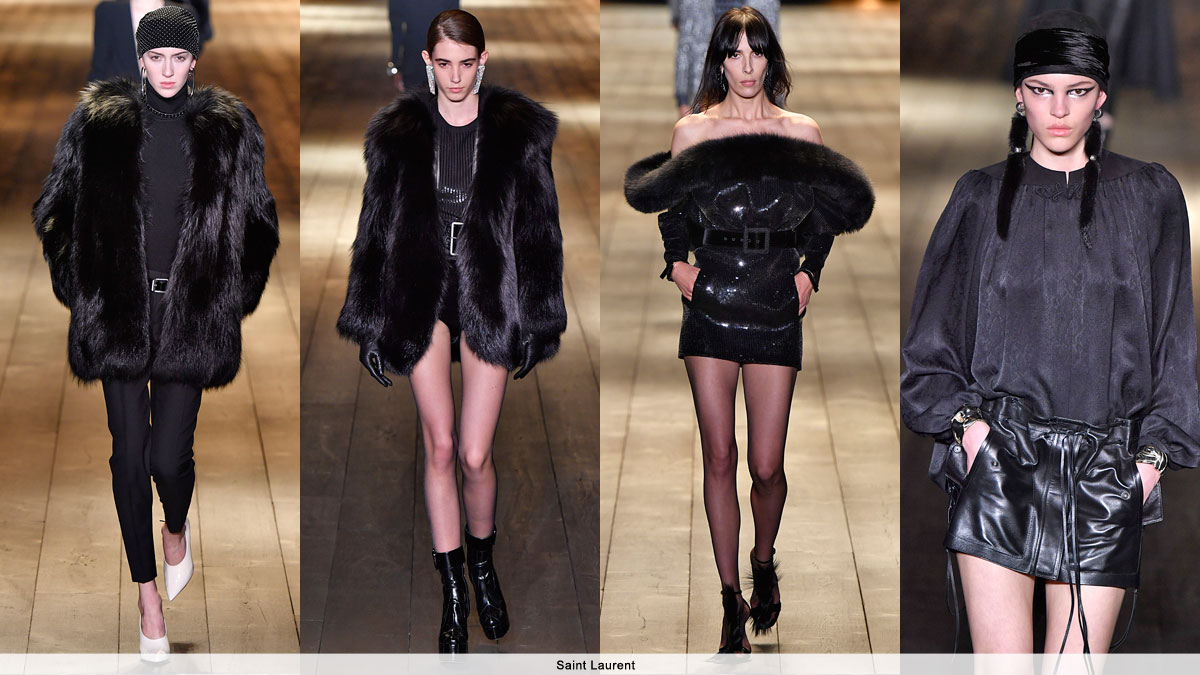 For further proof that fur is serious ‘don’t mess with me’ power dressing, Anthony Vaccarello showed a series of black mink and fox looks, among them two rock ‘n’ roll villainess fox jackets. Model Jamie Bochert in a sequinned black mini off shoulder dress with a sculpted dyed black Blue Fox trim gave new life to the LBD, while leather shorts were similarly souped up with Blue Fox. And as for what will surely be one of AW18’s major accessory pieces: well, it’s got to be Saint Laurent’s black mink tail earrings. Sleek, chic and utterly sexy.