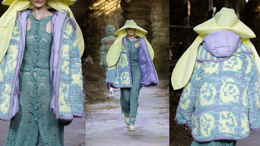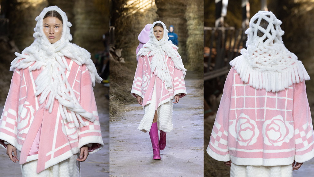 Kolmas asu koostuu kahdesta vaatteesta: mallin päässä oleva neulottua tekstuuria muistuttava huivi, sekä vaaleanpunainen leikattua minkkiä oleva takki, joka on kääritty mallin päälle huovan tavoin.