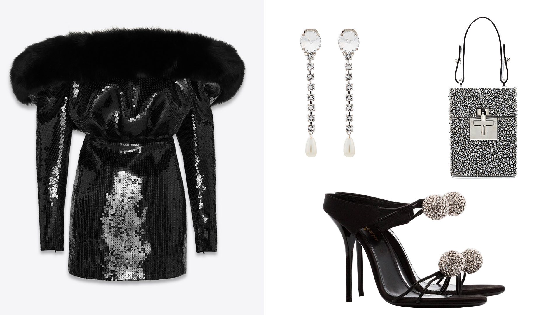 Outshine the disco ball and the midnight fireworks in a fox-trimmed Saint Laurent dress and megawatt accessories.
