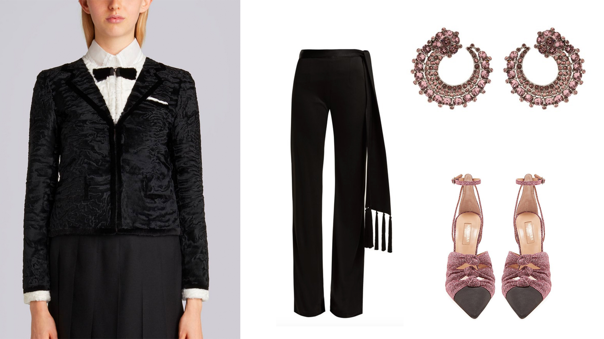 One-up the boys in a dyed mink and karakul trompe l’oeil tuxedo jacket by Thom Browne, the master of tongue-in-cheek illusion dressing, and pair with refined tailoring and shimmery accents.
