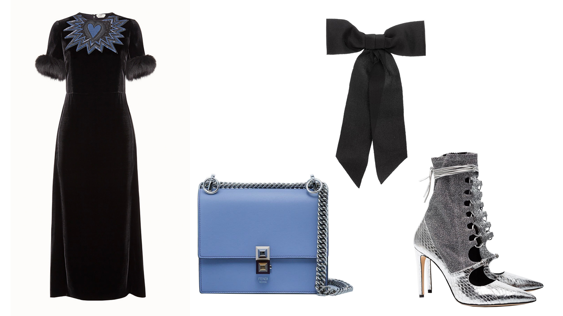A classic velvet dress becomes a game-changer with Fendi’s plush fox trims and intricate embroidery. Do it justice with a few well-chosen statement extras.
