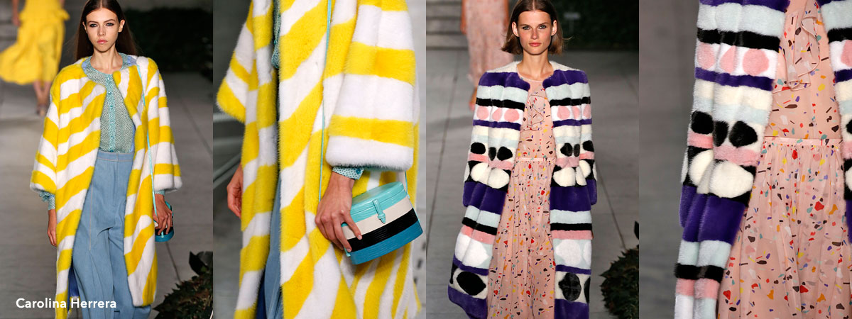 US Vogue chose Carolina Herrera’s white and yellow ice cream striped mink coat as the cover image for their review, and rightly so. The collarless piece perfectly summed up the clean, feminine and upbeat collection with a jolt of delectable energy. Elsewhere, Herrera used her signature silhouette – a roomy skirt with a nipped-in waist and a neat bodice – on a feminine dyed mink coat made up of contrasting stripes and discs.