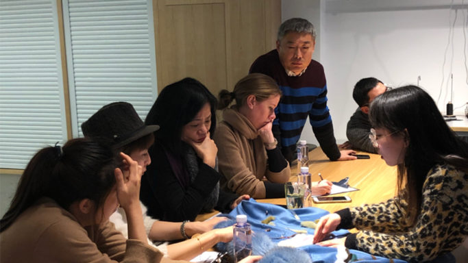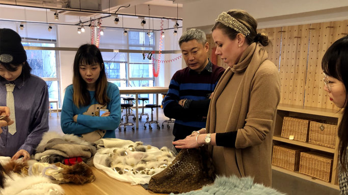经过了5天多的调研、构思、设计、制作之后,1月14日下午,终于迎来了展示工作营成果的时刻。嫵WOO设计经理赵蕾老师,世家皮草Saga Furs亚洲首席商务总监朱静珊女士、世家皮草设计中心的负责人Thea Larsen女士,以及北京服装学院海宁时尚产业园皮草设计与工艺讲师马倩老师作为评委,共同对学员们的作品进行最终的点评及评选。学员们一一向老师们陈述、展示了自己的皮草围巾作品,在展示和交流的过程中让彼此深化对设计主题的理解。